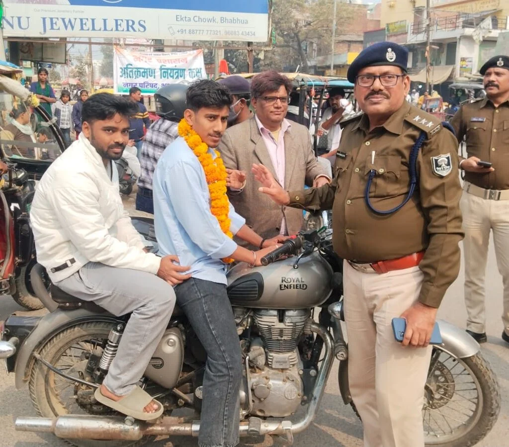 कैमूर/भभुआ || सड़क सुरक्षा सप्ताह के दौरान शनिवार को परिवहन विभाग और ट्रैफिक पुलिस ने रोको-टोको अभियान चलाते हुए दो पहिया और चार पहिया वाहन चालकों को जागरुक किया. इस मौके पर जो भी बाइक सवार बिना हेलमेट के रहें या फिर कोई भी चारपहिया वाहन चालक बगैर सीटबेल्ट के वाहन चलाते नजर आए तो उन्हें फूल माला पहनाकर व फूल देकर सम्मानित करते हुए उन्हें ट्रैफिक नियम का नियम का पालन करने के लिए जागरुक किया गया.