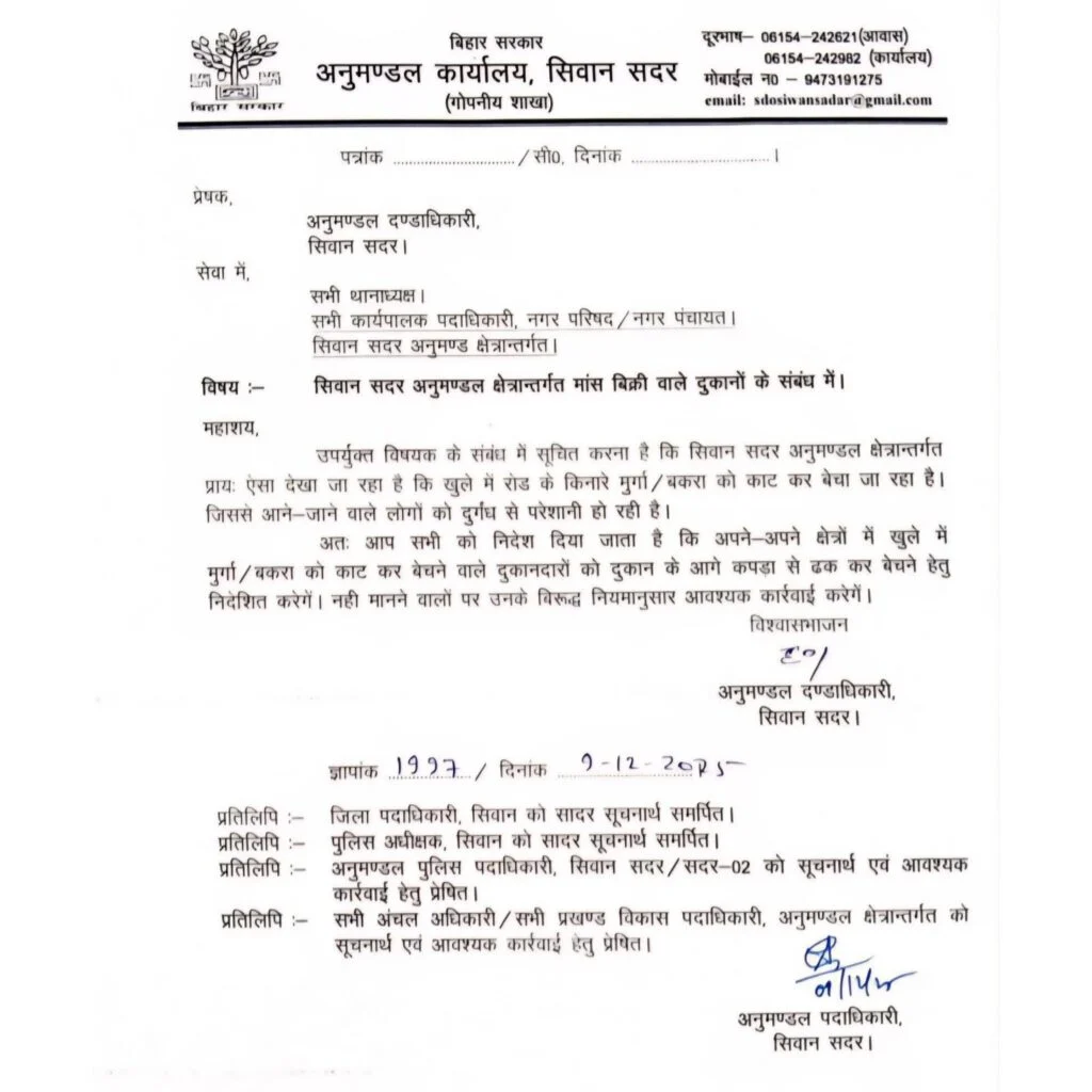 सदर एसडीओ के कार्यालय से जारी ज्ञापांक संख्या 1997/ दिनांक 9-12-2075 में एसडीओ ने आदेश दिया है कि सदर अनुमंडल क्षेत्रान्तर्गत प्रायः ऐसा देखा जा रहा है कि खुले में रोड के किनारे मुर्गा / बकरा को काट कर बेचा जा रहा है, जिससे आने-जाने वाले लोगों को दुर्गंध से परेशानी हो रही है. इसलिए मुर्गा / बकरा को खुले में काट कर बेचने वाले दुकानदारों को निदेश दिया जाता है कि वे अपने-अपने क्षेत्रों में खुले में मुर्गा / बकरा को काट कर बेचने वाले दुकानदार दुकान के आगे कपड़ा से ढक कर बेचे. आदेश का पालन नहीं मानने वालों पर उनके विरुद्ध नियमानुसार आवश्यक कार्रवाई की जाएगी. इसके लिए सीवान सदर अनुमंडल क्षेत्र के तहत सभी थानाध्यक्ष, सभी कार्यपालक पदाधिकारी, नगर परिषद व नगर पंचायत इस पर एक्शन लेंगे. इसके अलावे इस कार्रवाई की सूचना हेतु जिला पदाधिकारी से लेकर पुलिस अधीक्षक सीवान सहित अनुमंडल पुलिस पदाधिकारी सीवान, सदर /अनुमंडल पुलिस पदाधिकारी सदर-02 को सूचनार्थ एवं आवश्यक कार्रवाई हेतु चिट्ठी की प्रतिलिपि प्रेषित की गई है. साथ हीं सभी अंचल अधिकारी और सभी प्रखंड विकास पदाधिकारियों को भी खबर दी गई है.