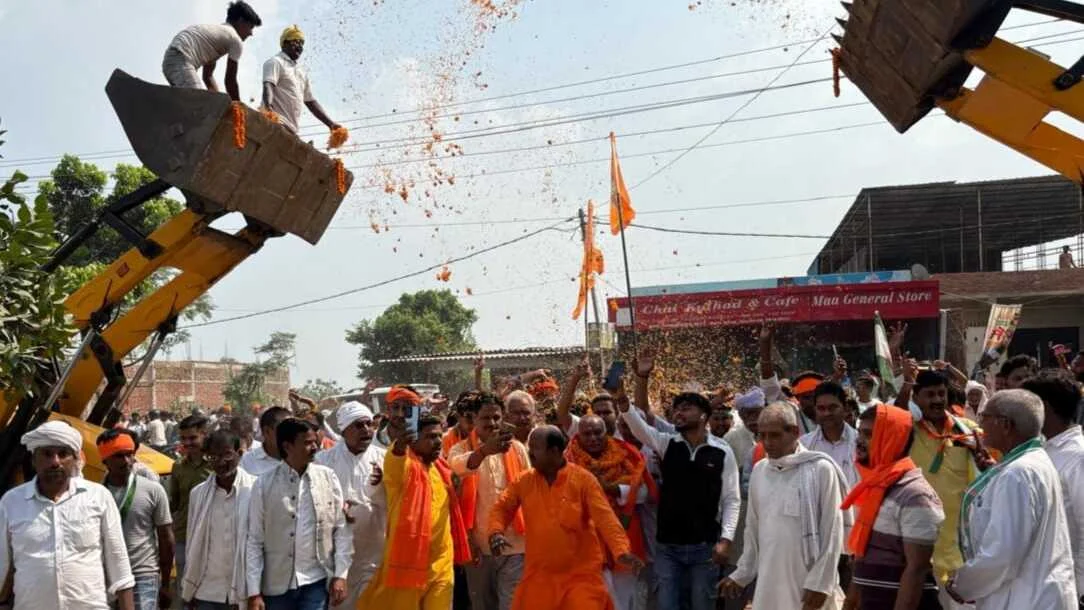 सीवान : नामांकन से पहले इंद्रदेव सिंह पटेल का भव्य स्वागत, यमुना गढ़ में जेसीबी से हुई फूलों की वर्षा