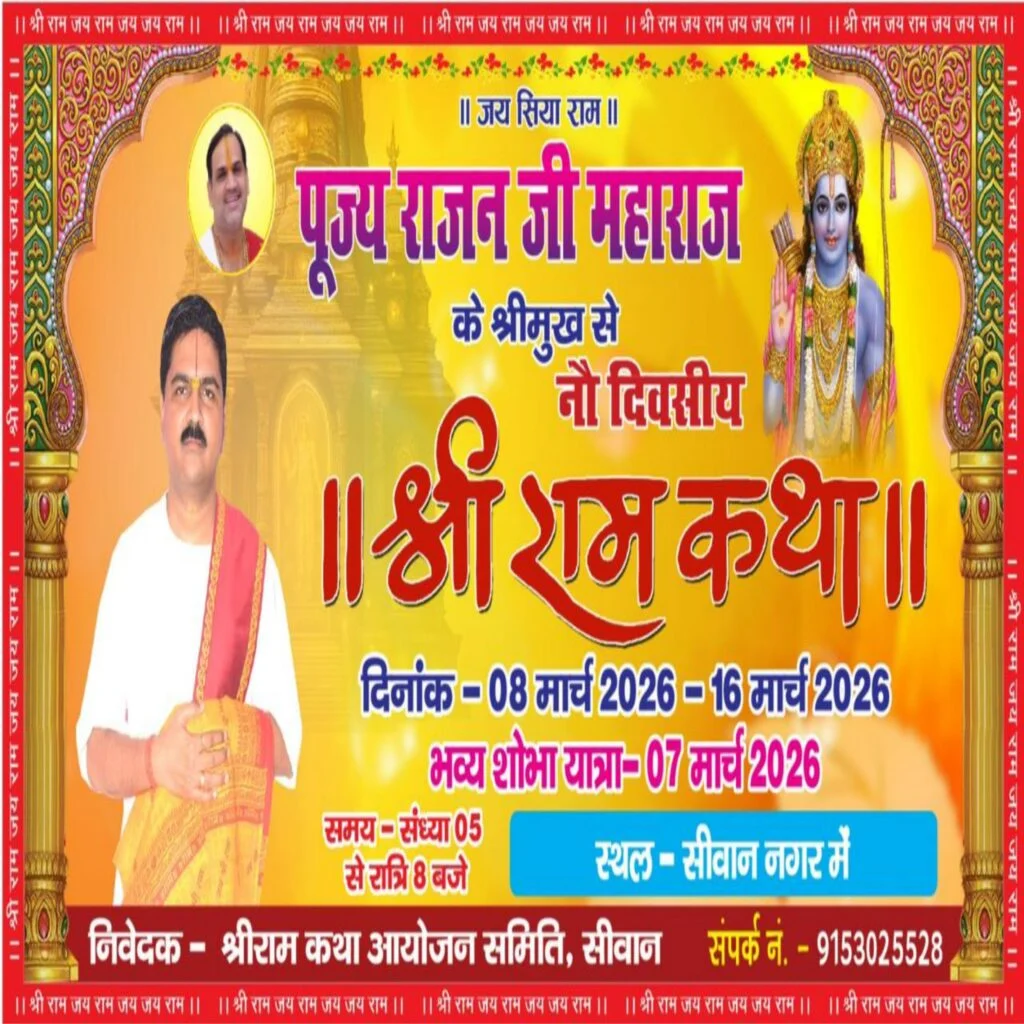 सीवान || जिले से बड़ी खबर है, जहां अंतर्राष्ट्रीय श्रीरामकथा वाचक एवं सीवान के लाल पूज्य राजन जी महाराज के श्रीमुख से संगीतमय श्रीरामकथा का रसपान जिलेवासी एक बार फिर से करेंगे. श्रीरामकथा आयोजन समिति, सीवान एवं जिले के समस्त सनातनियों के सहयोग से आगामी 8 मार्च 2026 से 16 मार्च 2026 तक श्रीरामकथा होगा.